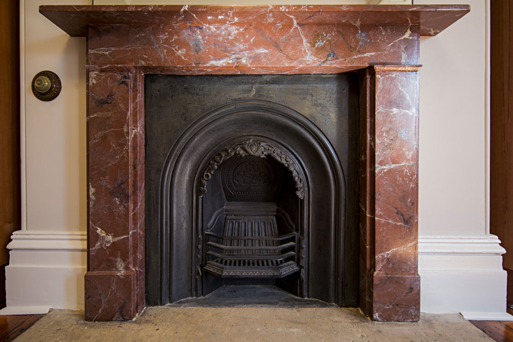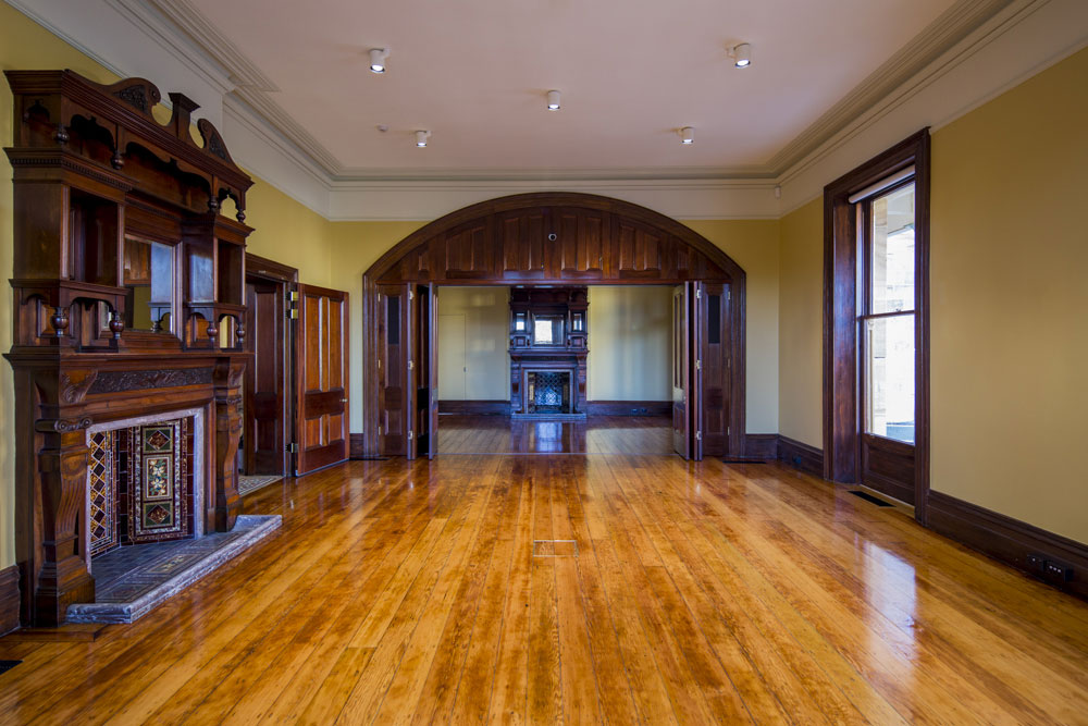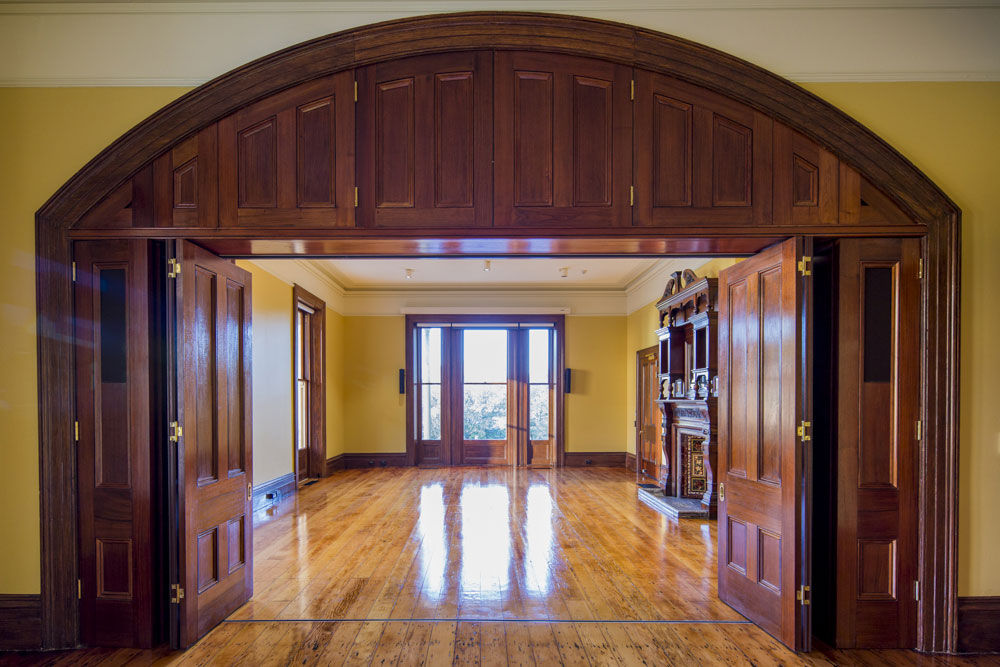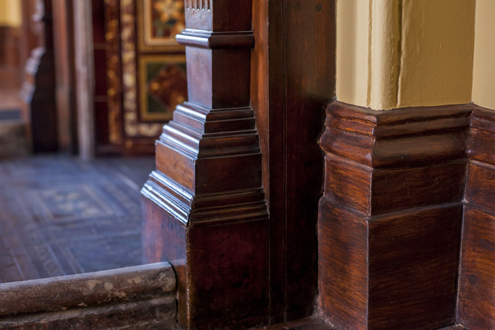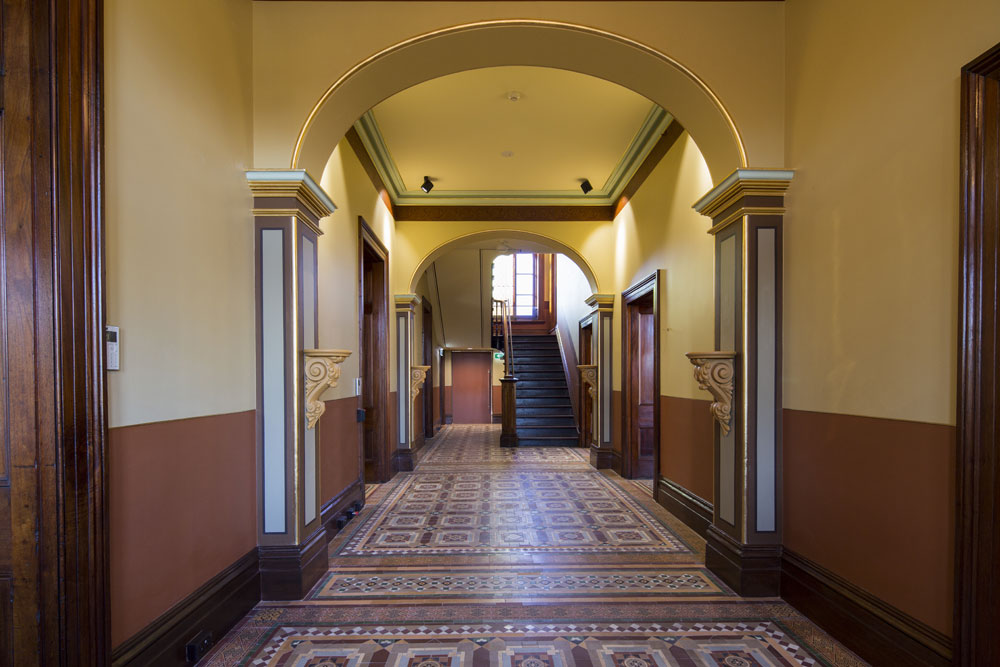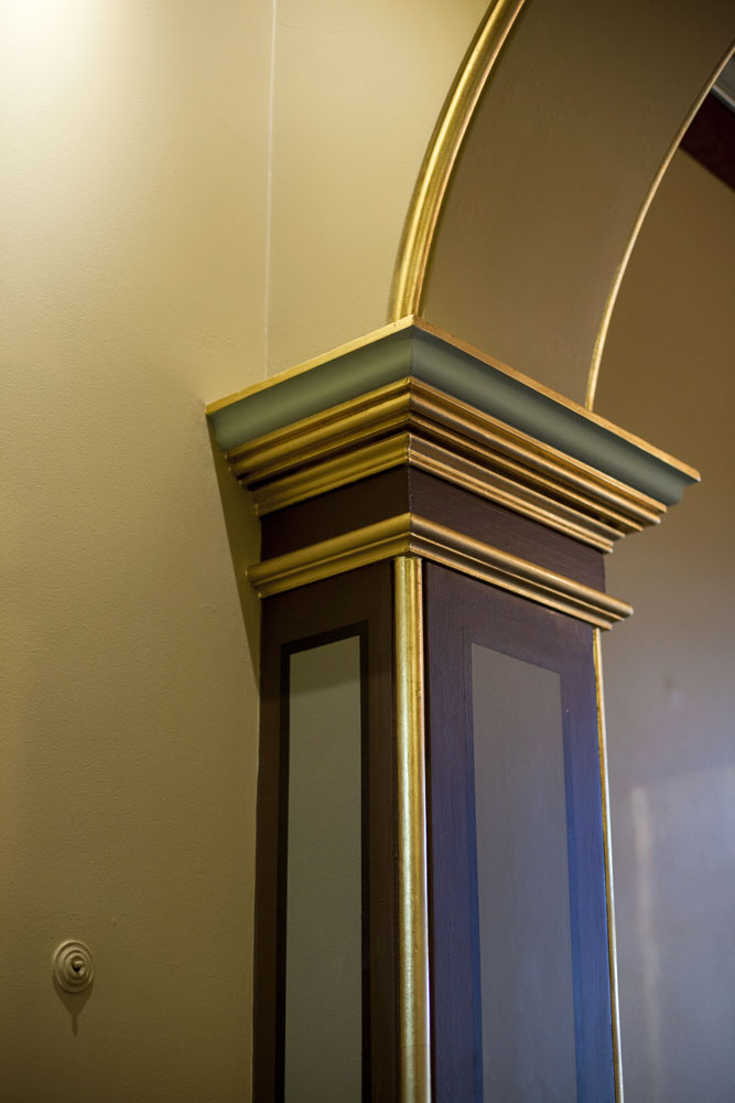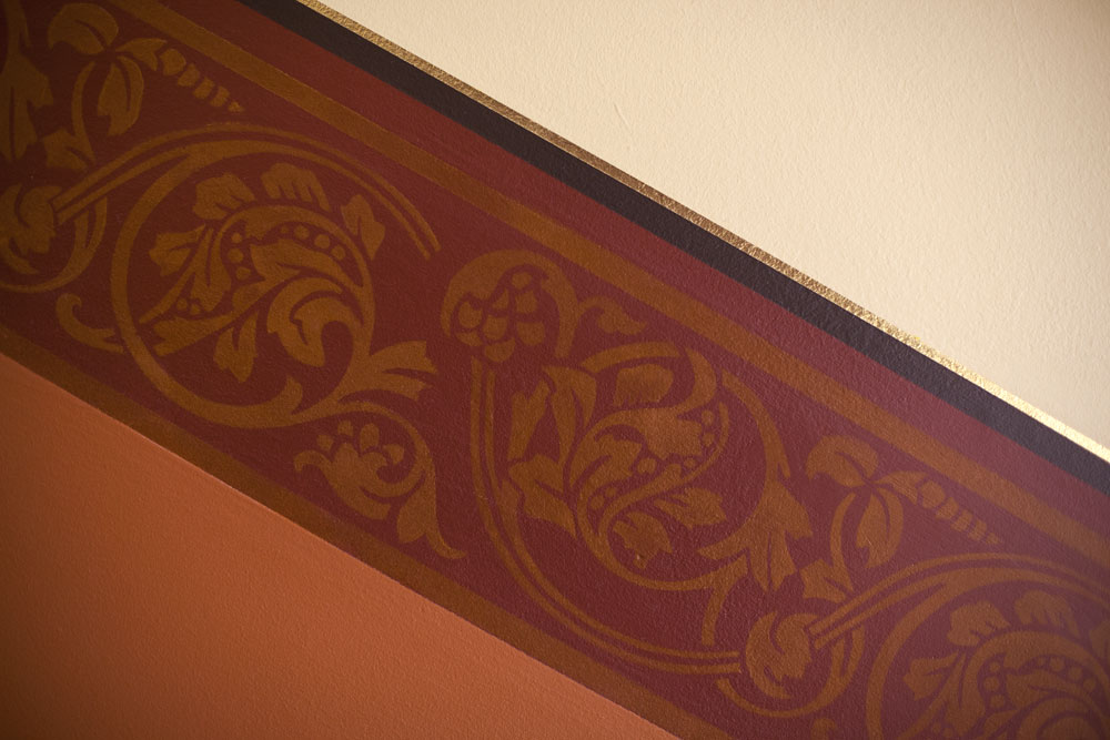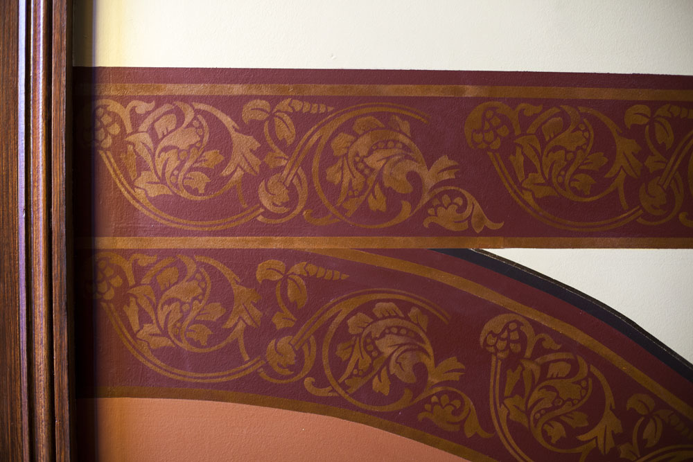Graythwaite, Heritage Building Restoration: Shore School North Sydney. The entrance Hallway to Graythwaite has been treated with gold leaf on column capitols, corner bullnoses and archways. Skirtings have been woodgrained. The Original Ballroom: Woodgraining of the archway, windows, architraves and skirting boards. Cedar Timber finish with two layers of satin varnish. All finishes completed with water based paints and pigments. The traditional fire place at Graythwaite had damaged slate. We matched it up to the fire place in the room next door. The result was stunning. Hand painted marble finish with 5 layers. Completed with two coats of an oil based marine varnish. Hand painted stencil to match existing heritage pattern. All the colours for the stencil had to be hand mixed to try and match up the exact colours after ageing and ruin.